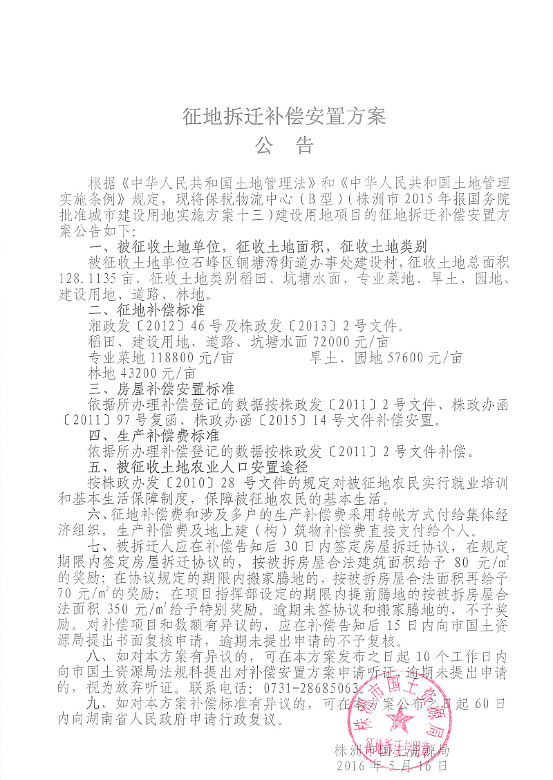 安置公告-保税物流中心B型(株洲市2015年报国务院实施方案十三)