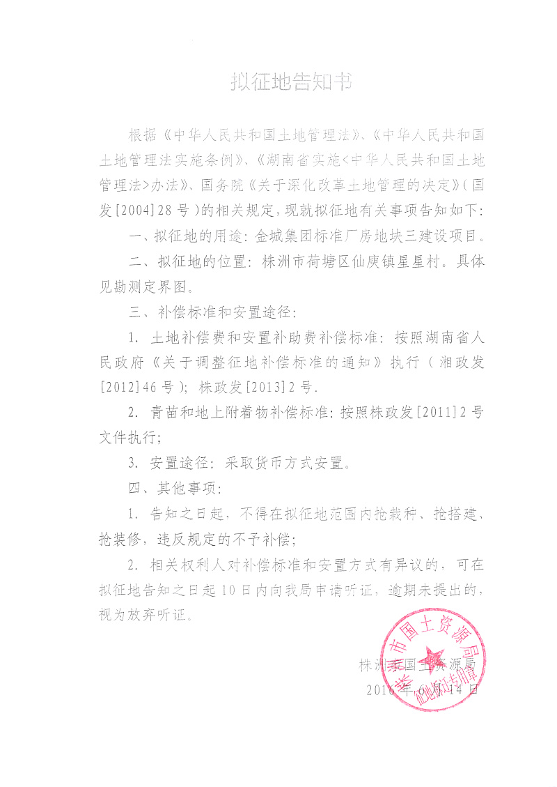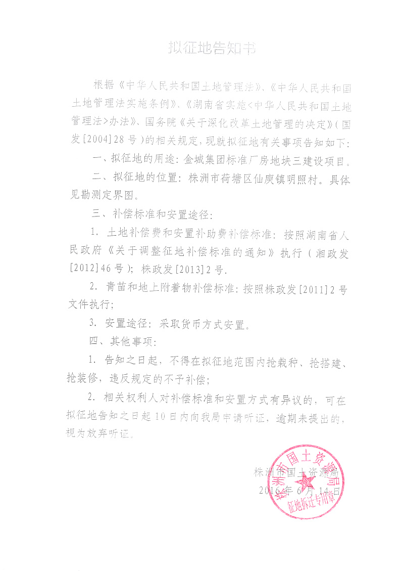 拟征地公告-金城集团标准厂房地块三