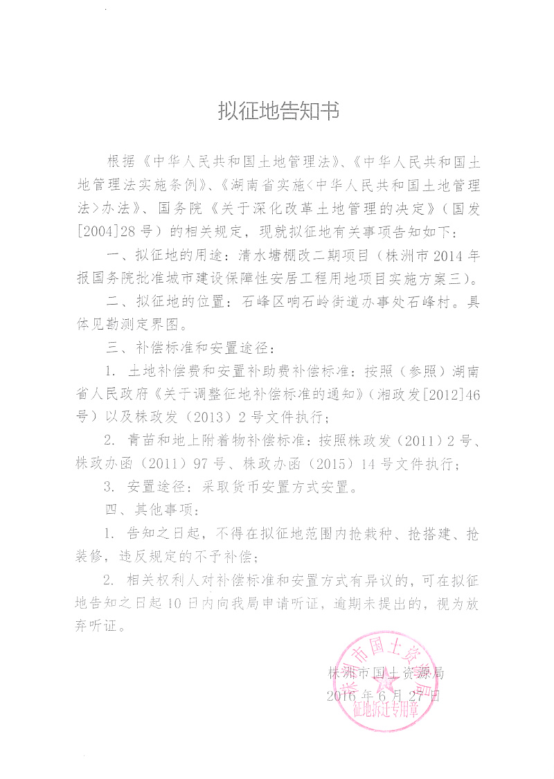 拟征地公告-清水塘棚改二期(2014年报国务院保障性安居工程实施方案三)