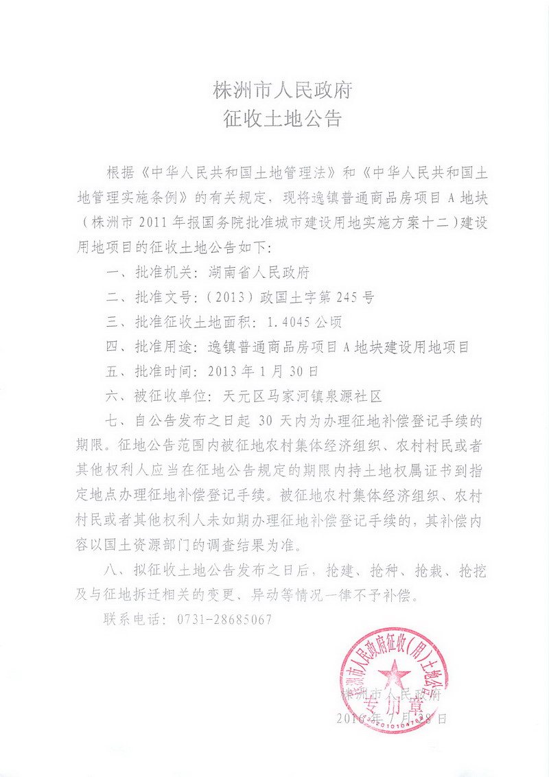 征地公告-逸镇普通商品房项目A地块(2011报国务院实施方案十二)