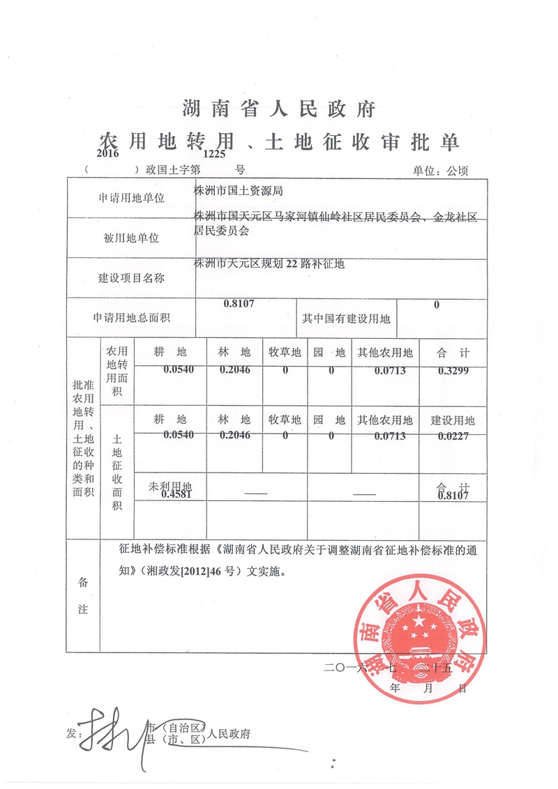 株洲市天元区规划22路补征地(2016)政国土字第1225号