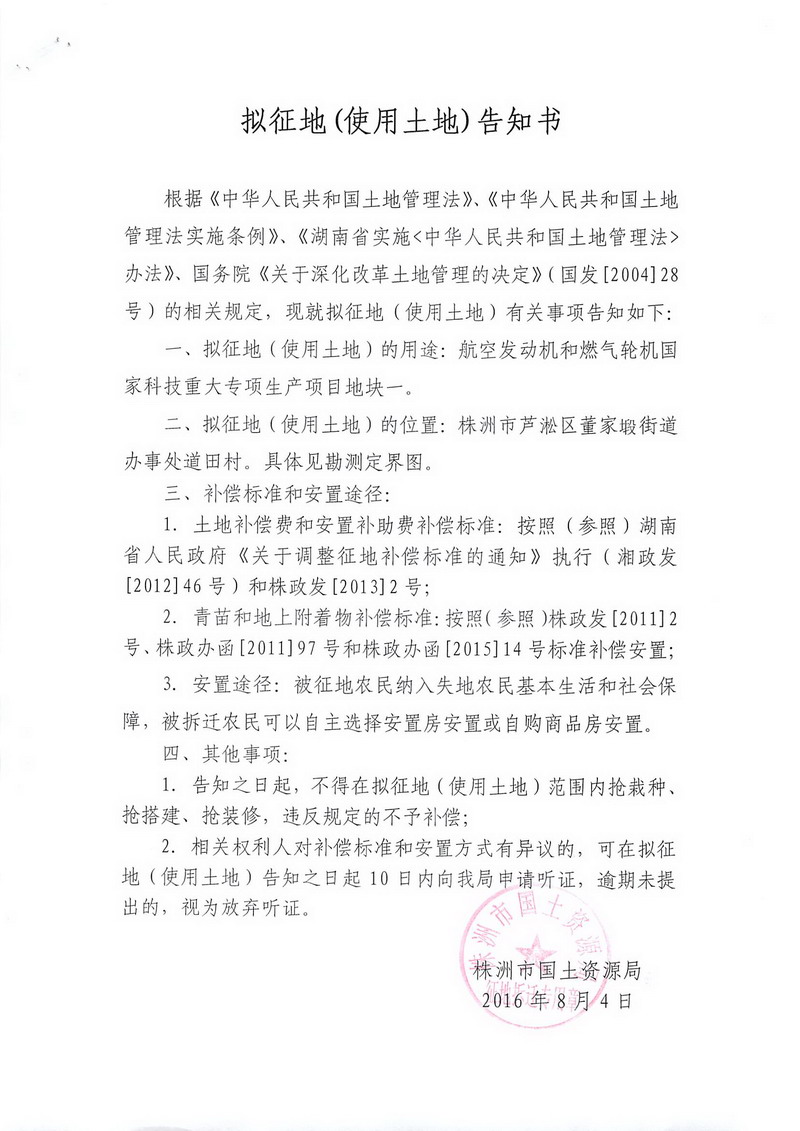 拟征地告知书-航空发动机和燃气轮机国家科技重大专项生产项目地块一
