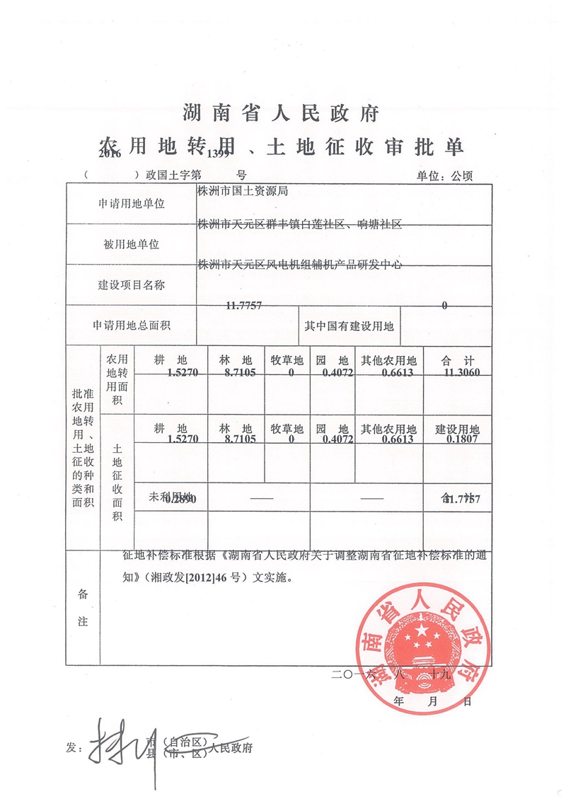 株洲市天元区风电机组辅机产品研发中心项目(2016)政国土字第1399号