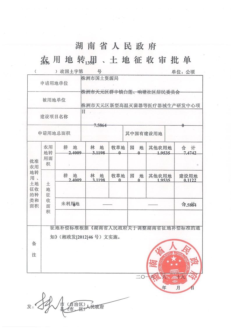 株洲市天元区新型高温灭菌器等医疗器械生产研发中心项目(2016)政国土字第1398号