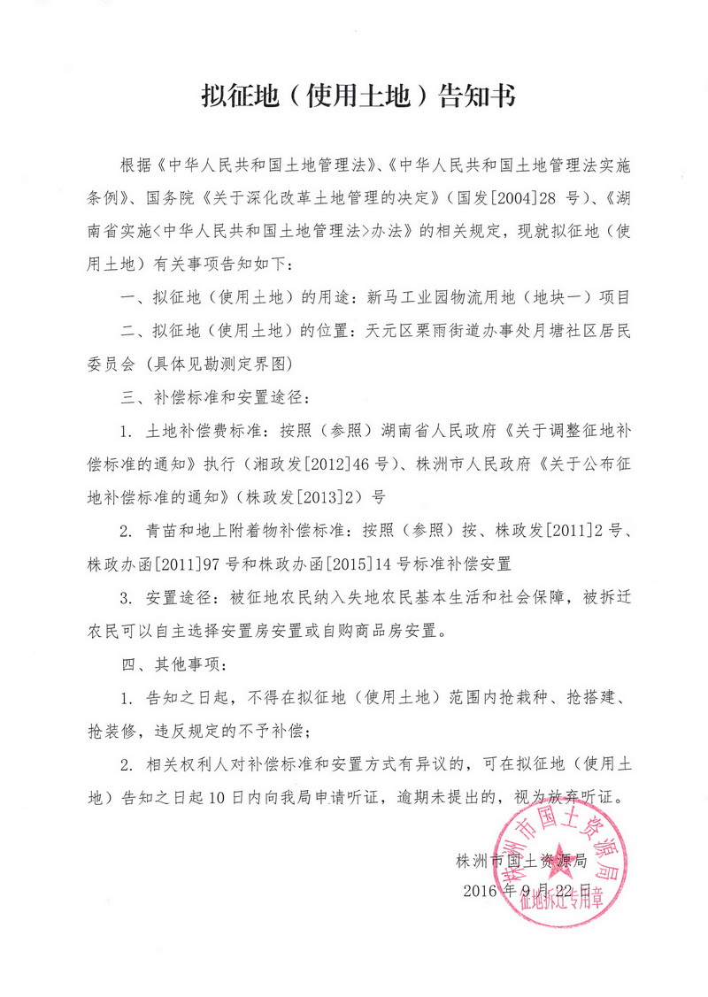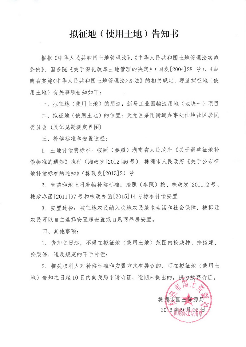 拟征地告知书-新马工业园物流用地(地块一)