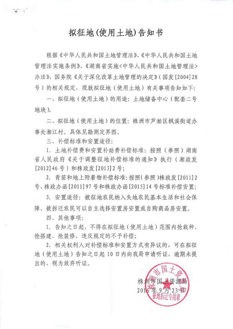 拟征地告知书-土地储备中心(配套二号地块)芦淞区枫溪街道办事处湘江村