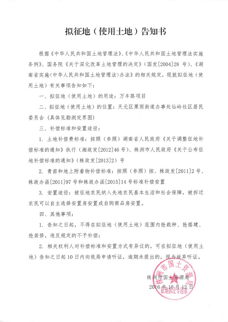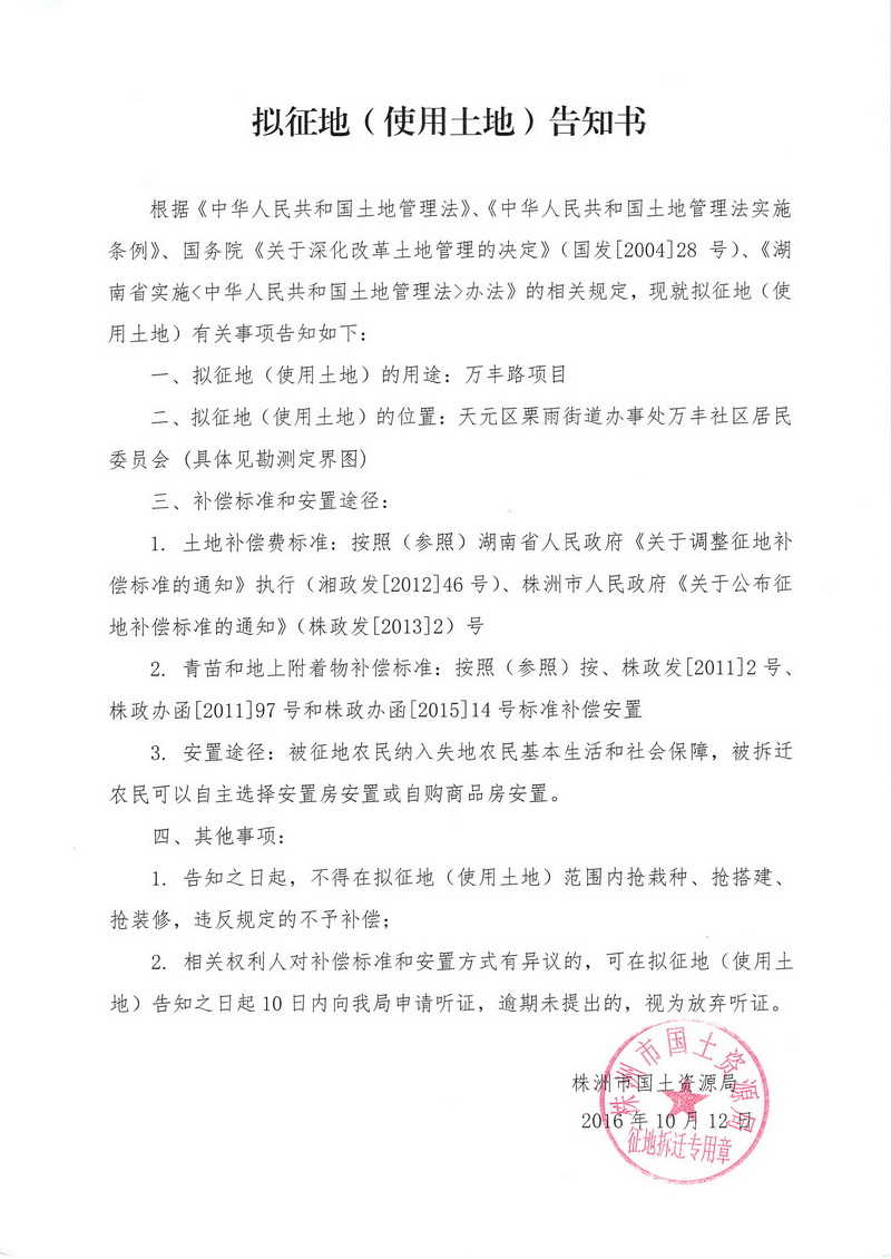 拟征地告知书-万丰路项目