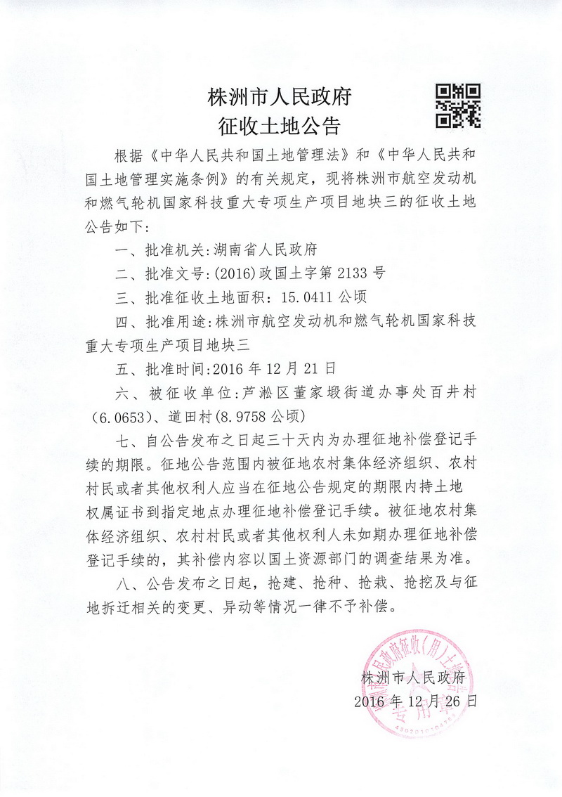 征地公告-株洲市航空发动机和燃气轮机国家科技重大专项生产项目地块三