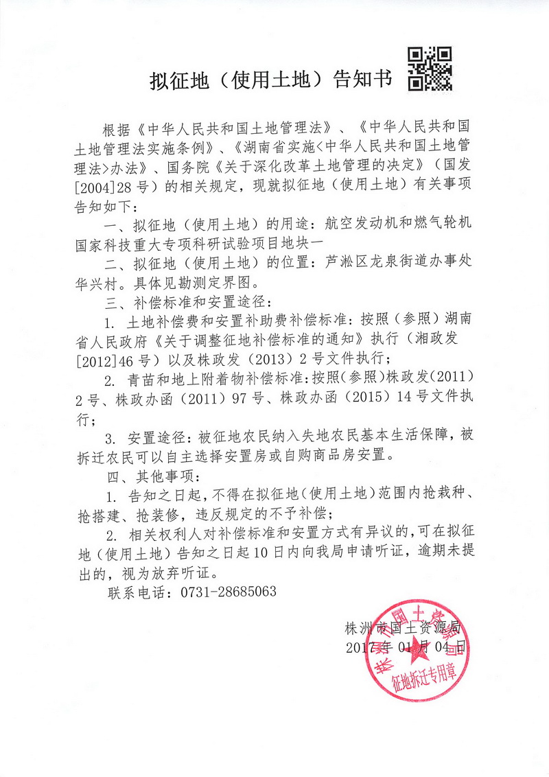 拟征地告知书-航空发动机和燃气轮机国家科技重大专项科研试验项目地块一