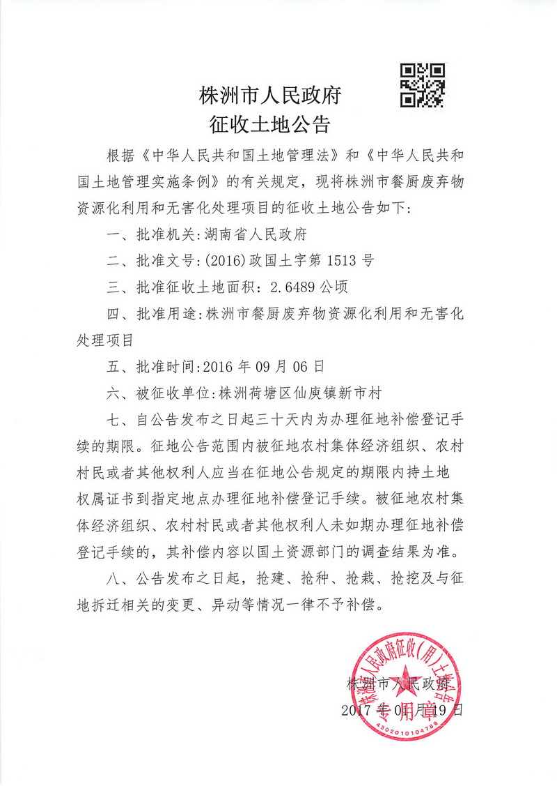 征收公告-株洲市餐厨废弃物资源化利用和无害化处理项目