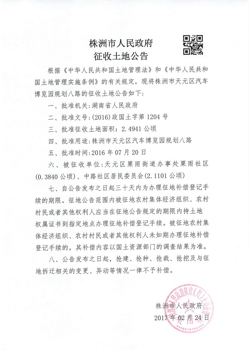征收公告-株洲市天元区汽车博览园规划八路项目