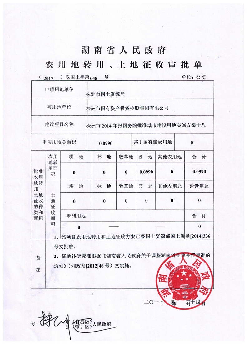 株洲市2014年报国务院批准城市建设用地实施方案十八(2017)政国土字第648号