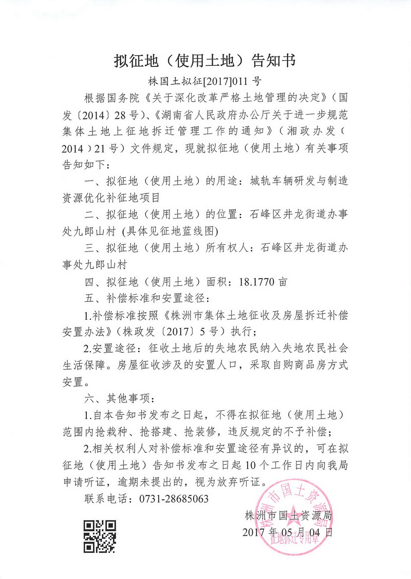 拟征地告知书-城轨车辆研发与制造资源优化补征地项目