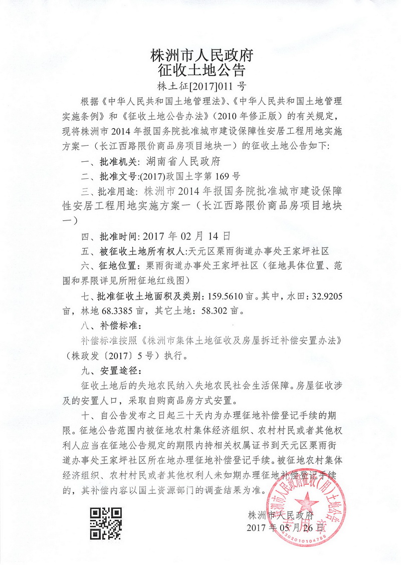 征收公告-株洲市2014年报国务院批准城市建设保障性安居工程用地实施方案