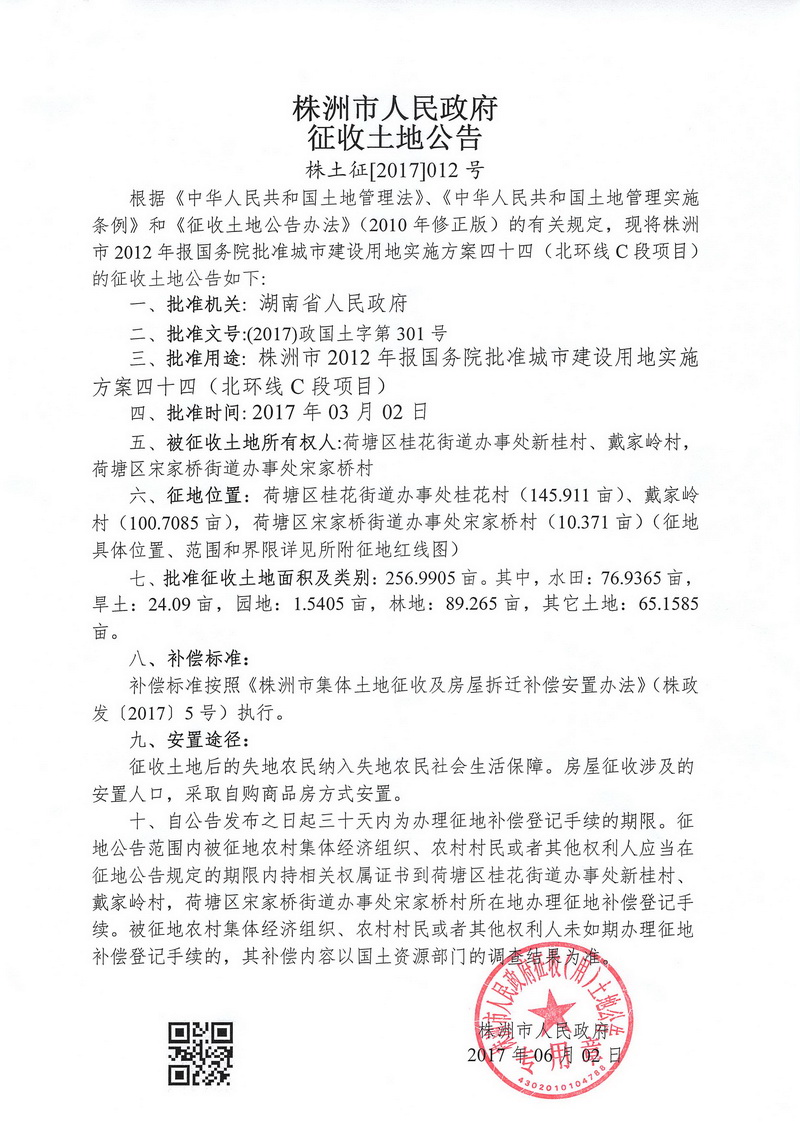 征收公告-株洲市2012年报国务院批准城市建设用地实施方案四十四(北环线C段项目)