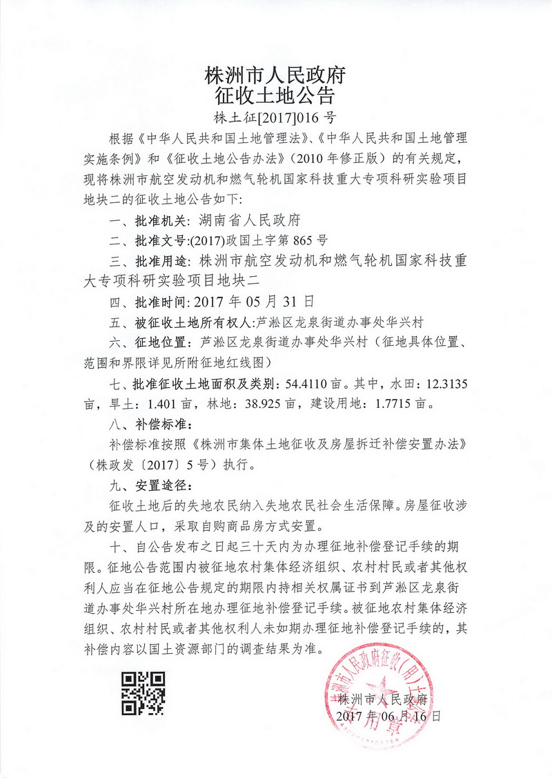 征收公告-株洲市航空发动机和燃气轮机国家科技重大专项科研试验项目地块二