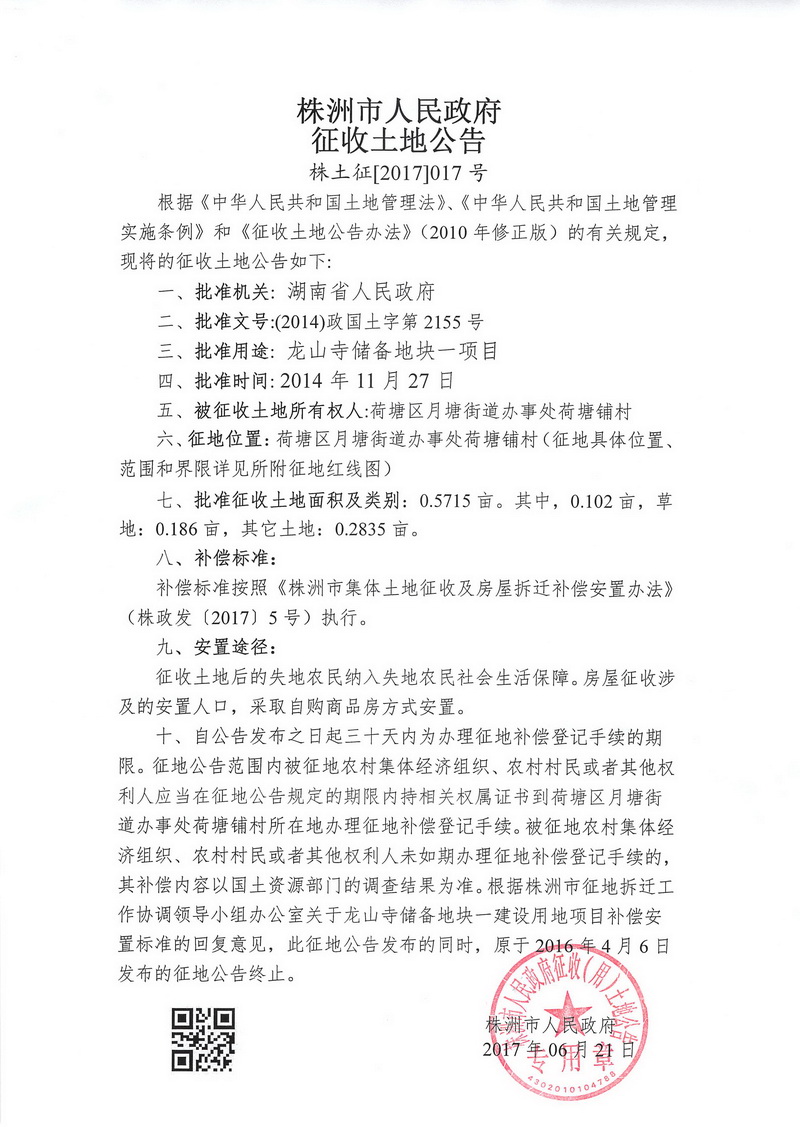 征收公告--龙山寺储备地块一项目