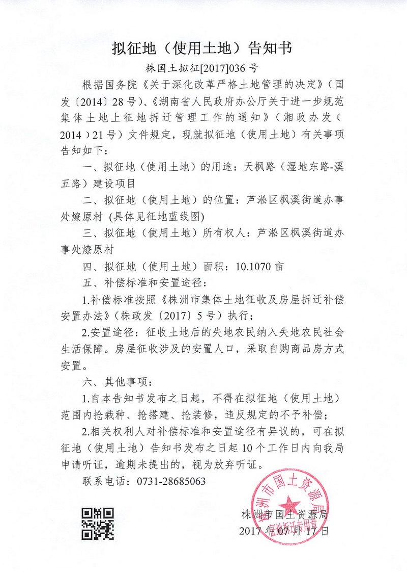拟征地告知书--天枫路(湿地东路-溪五路)建设项目