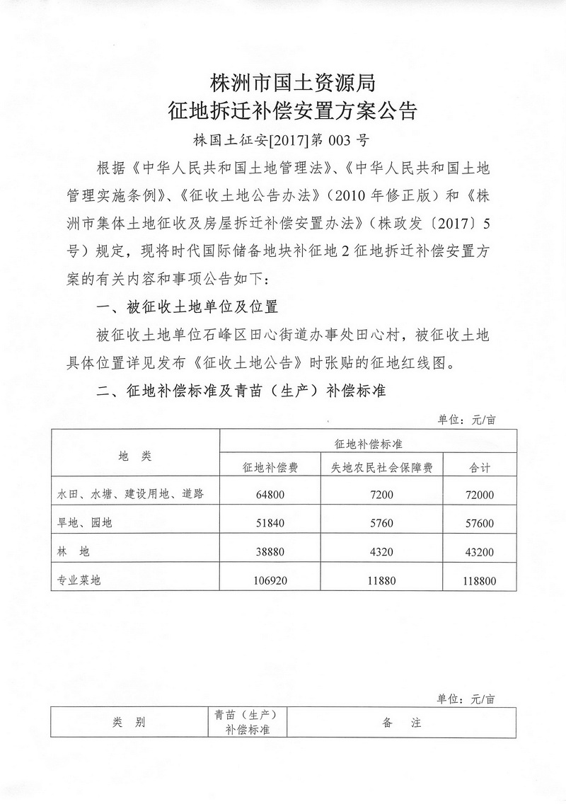 征地拆迁补偿安置方案公告--时代国际储备地块补征地二