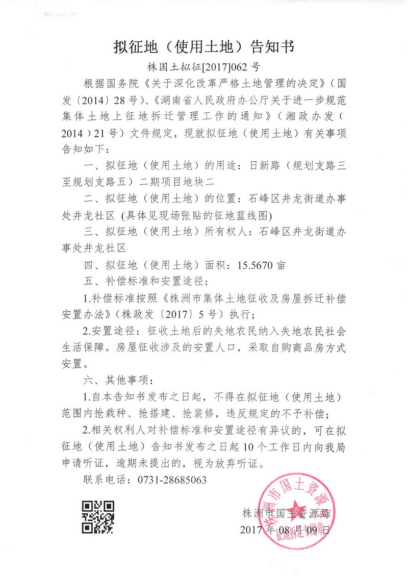 拟征地告知书--日新路(规划支路三--规划支路五)二期项目地块二