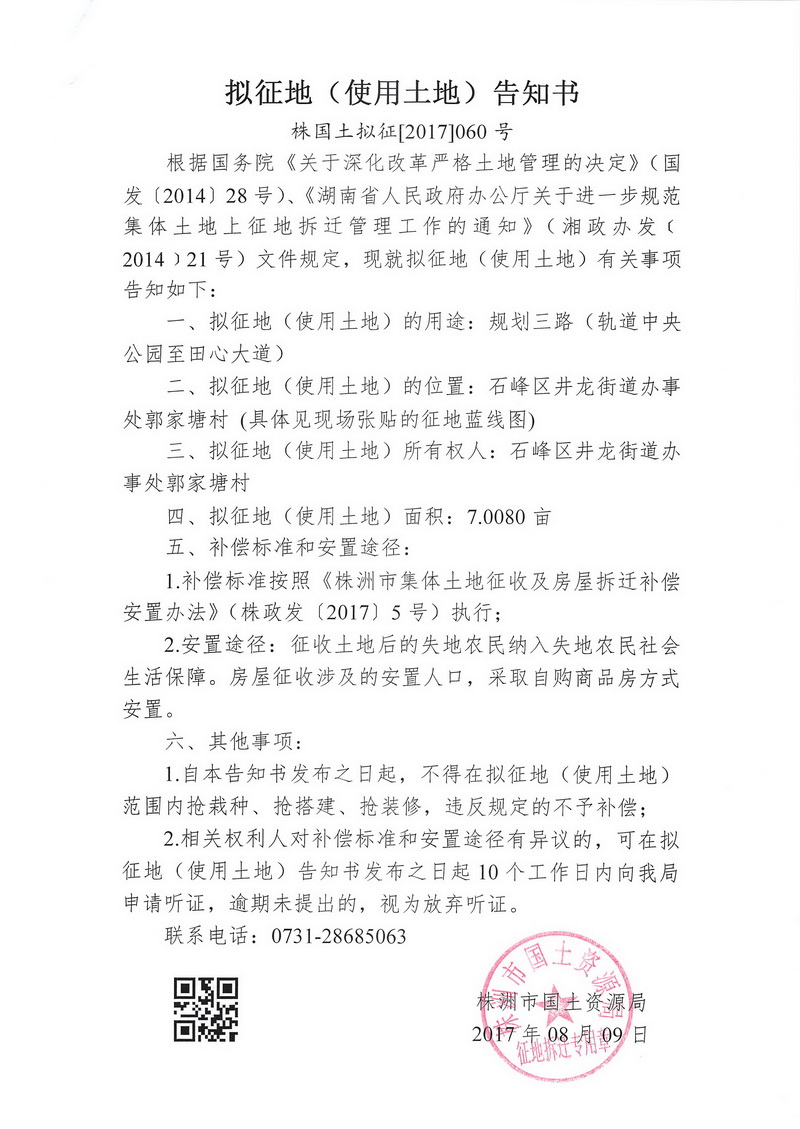 拟征地告知书--规划三路(轨道中央公园至田心大道)项目