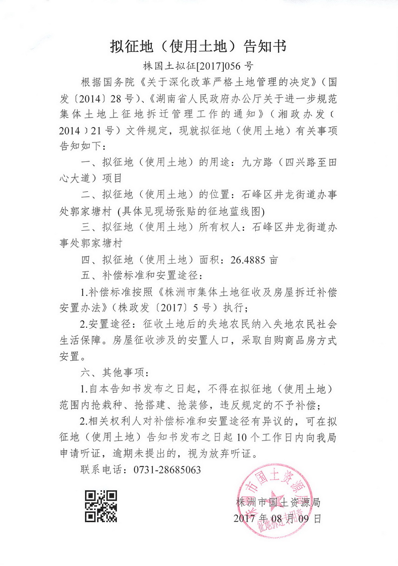 拟征地告知书--九方路(四兴路至田心大道)项目