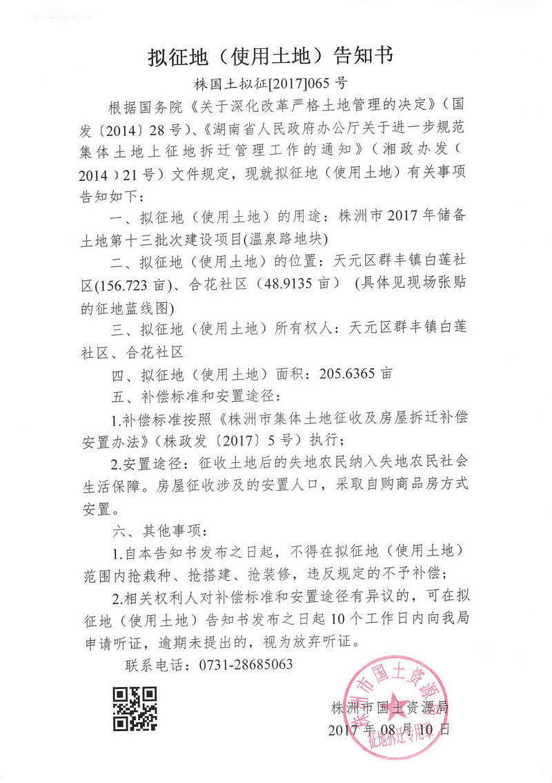 拟征地告知书--株洲市2017年储备土地第十三批次建设项目(温泉路地块)