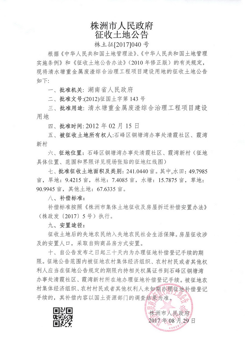 征收土地公告--清水塘重金属废渣综合治理工程项目