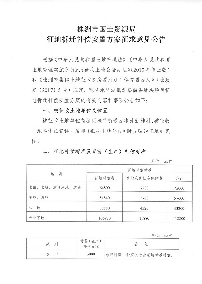征地拆迁补偿安置方案征求意见公告--水竹湖藏龙路储备地块项目