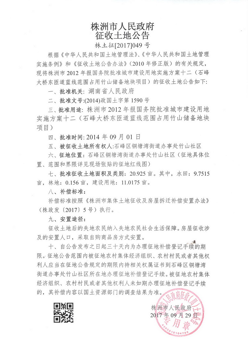 征收土地公告--石峰大桥东匝道蓝线范围占用竹山储备地块项目