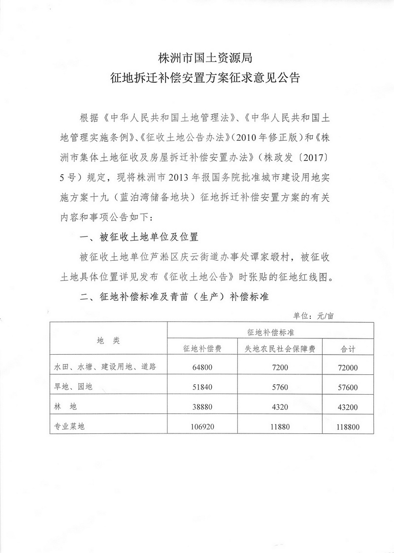 征地拆迁补偿安置方案征求意见公告--蓝泊湾储备地块