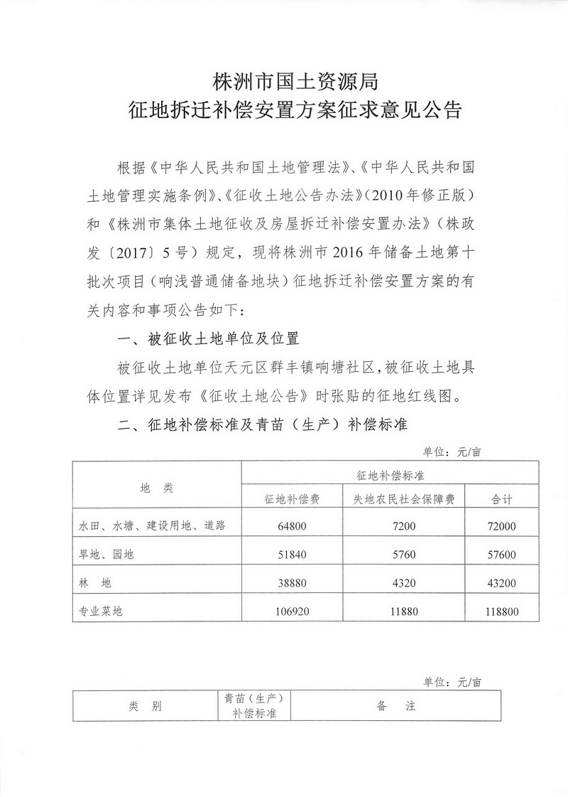 征地拆迁补偿安置方案征求意见公告--响浅普通储备地块项目