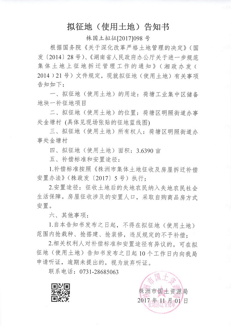 拟征地告知书--荷塘工业集中区储备地块一补征地项目
