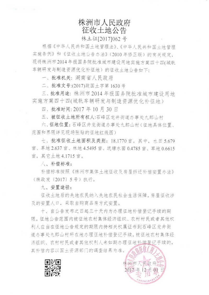 征收土地公告--城轨车辆研发与制造资源化补征地项目