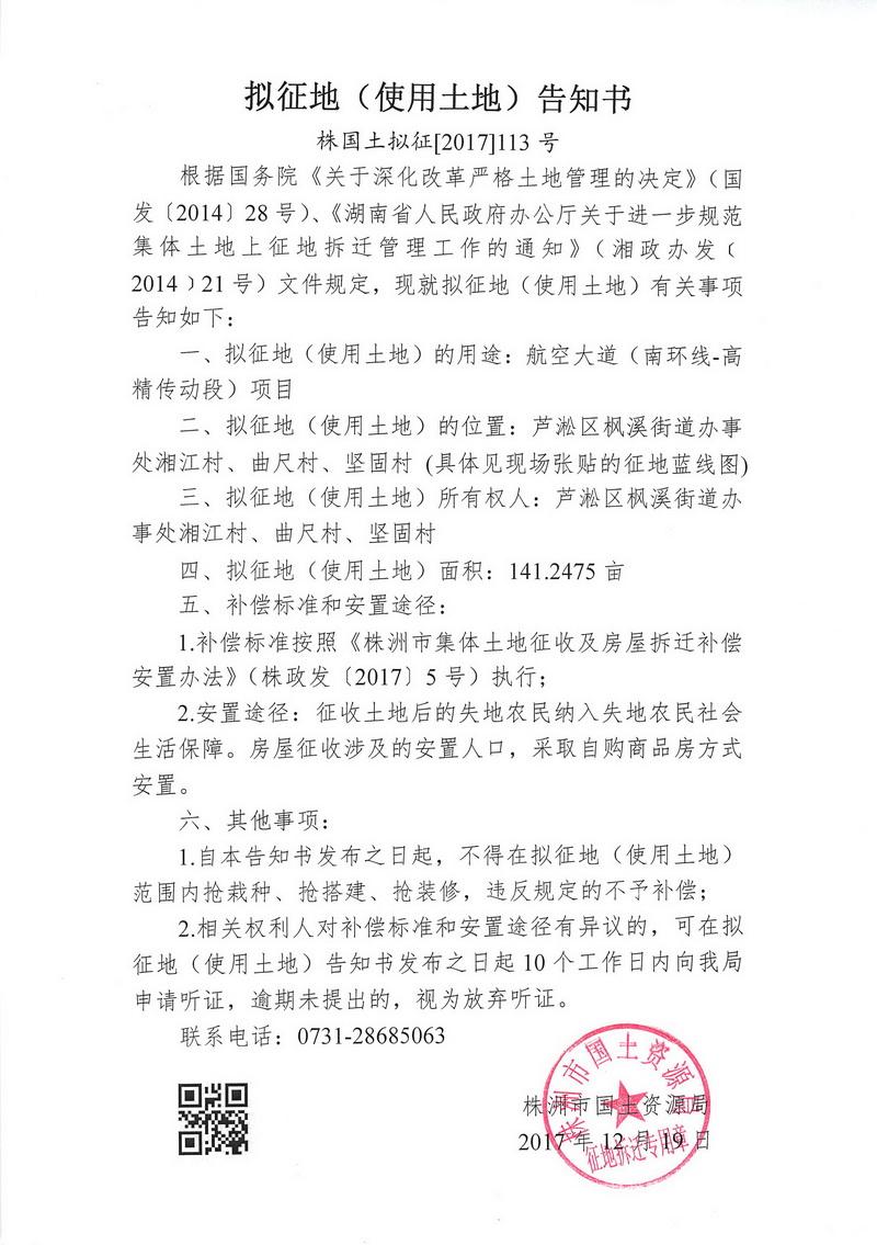 拟征地告知书--航空大道(南环线-高精传动段)项目