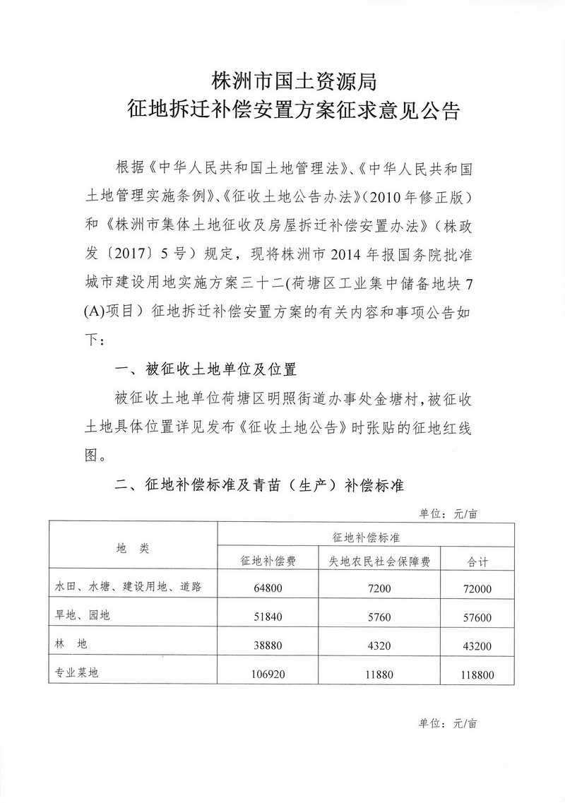 征地补偿安置方案征求意见公告--荷塘区工业集中区储备地块7(A)