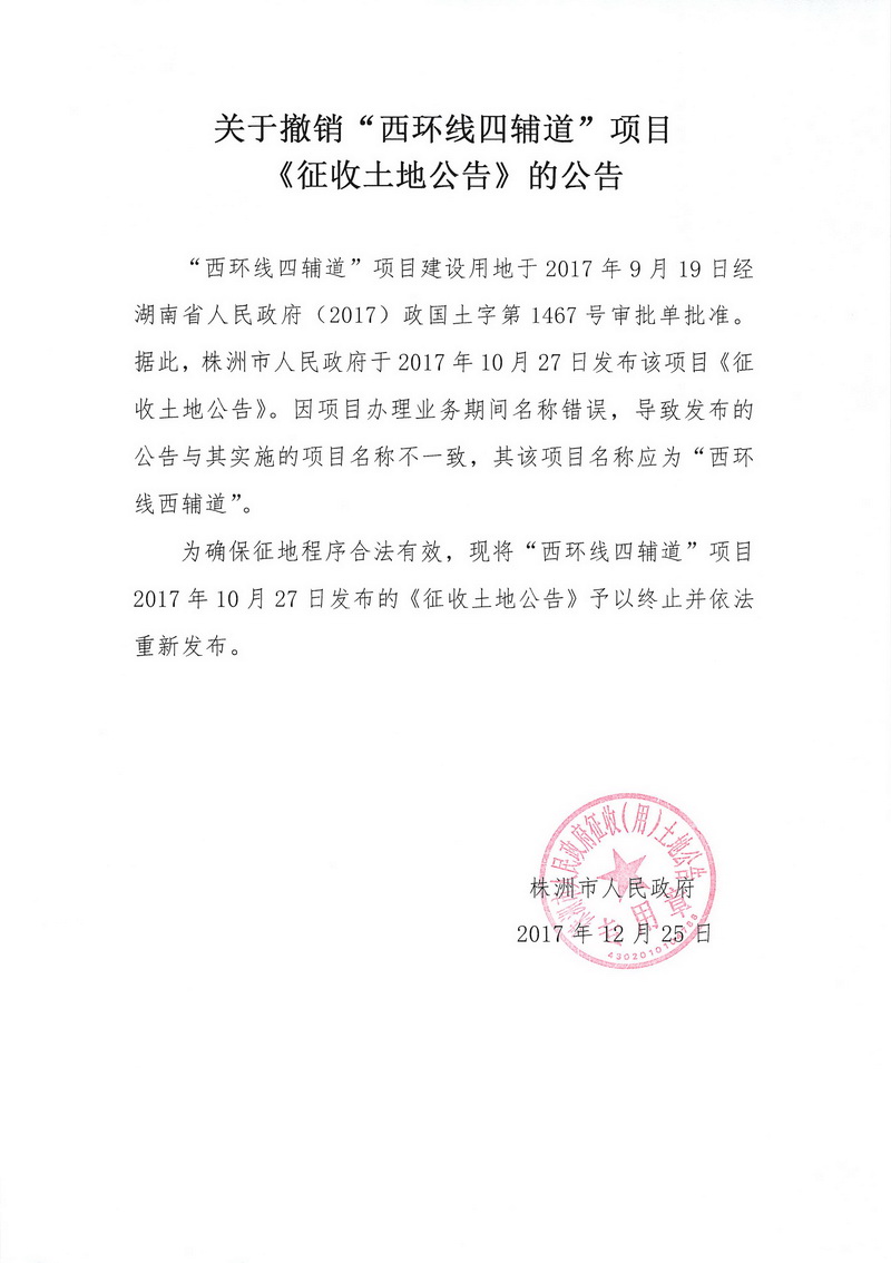 关于撤销“西环线四辅道”项目《征收土地公告》的公告
