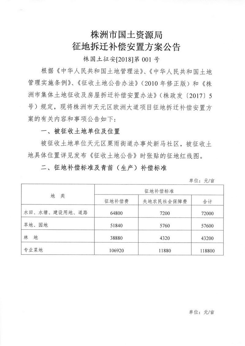 征地拆迁安置补偿方案公告--株洲市天元区欧洲大道项目