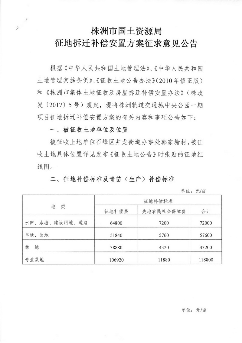 征地拆迁补偿补偿安置征求意见公告--株洲轨道交通城中央公园一期项目