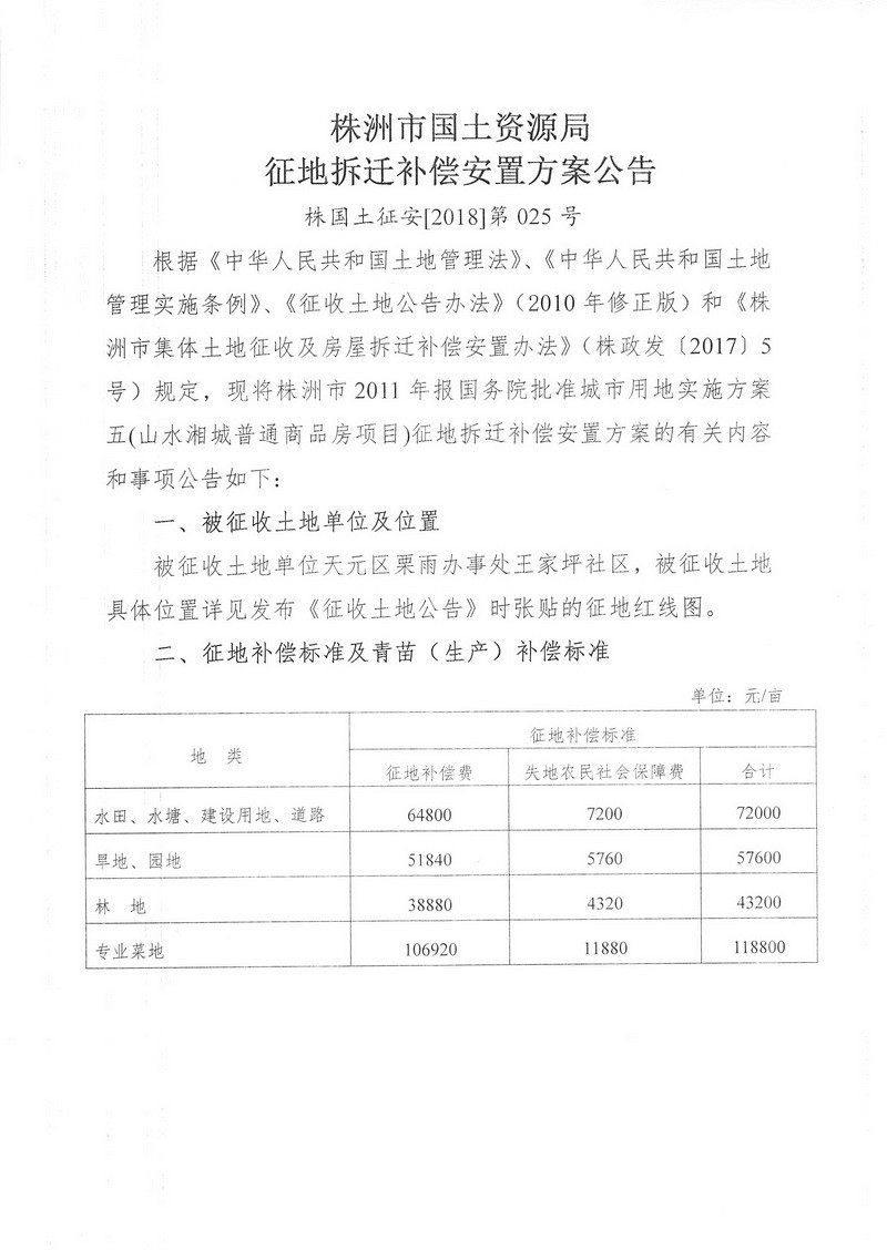 征地拆迁补偿安置方案公告-山水湘城普通商品房项目