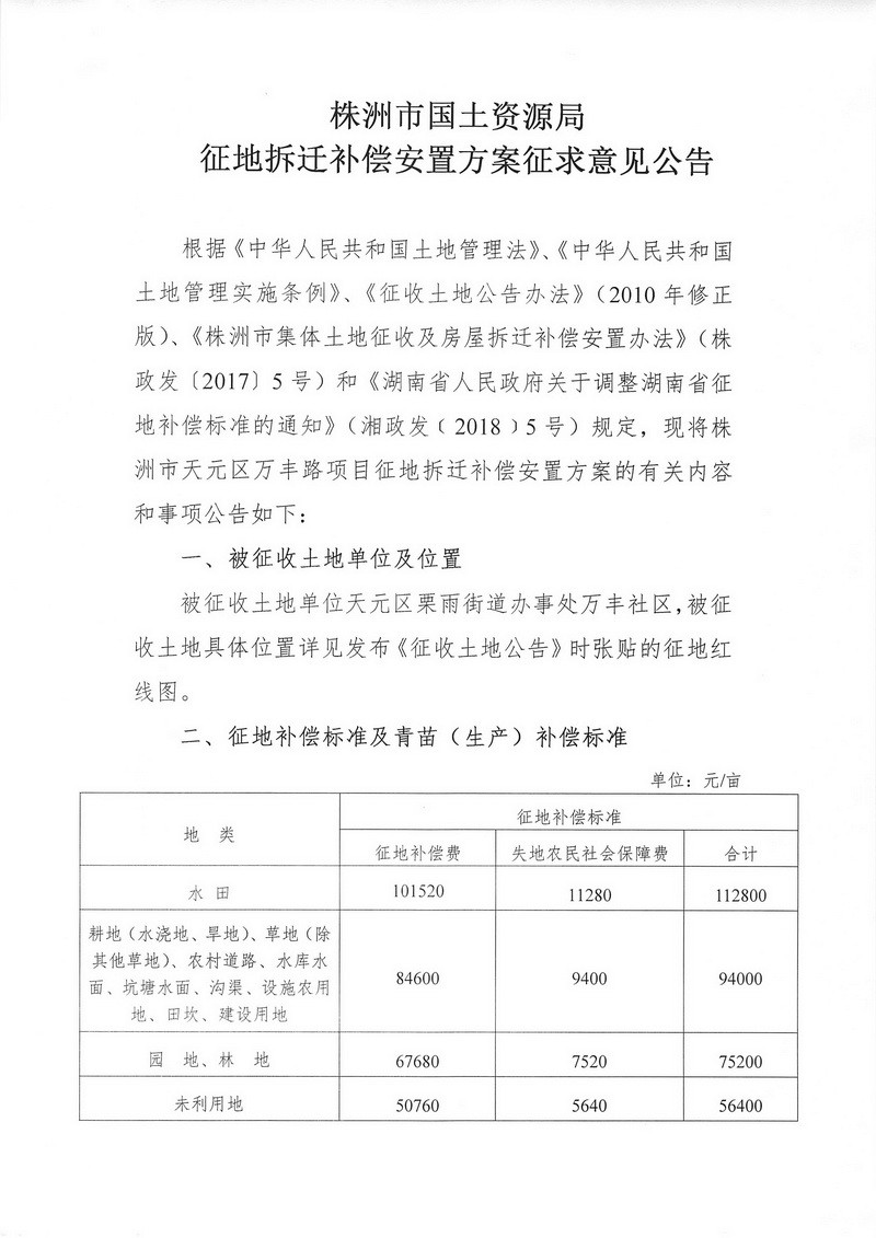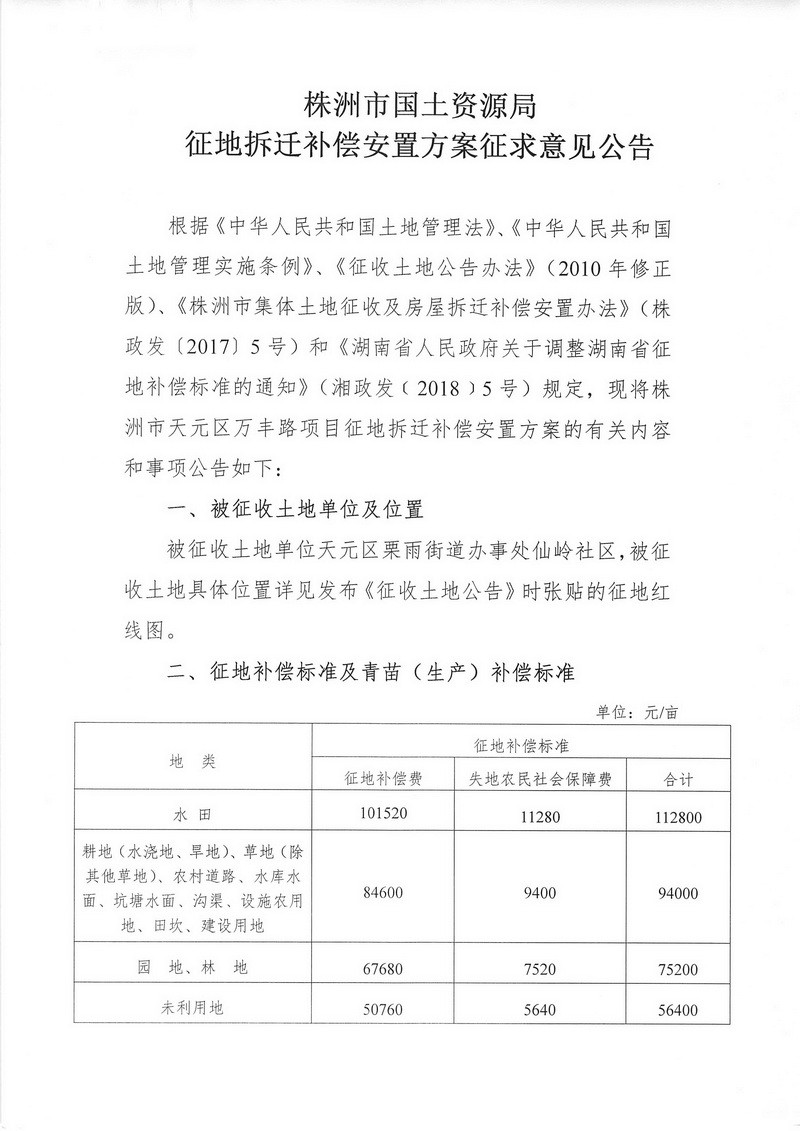 征地拆迁补偿安置方案征求意见公告-株洲市天元区万丰路项目