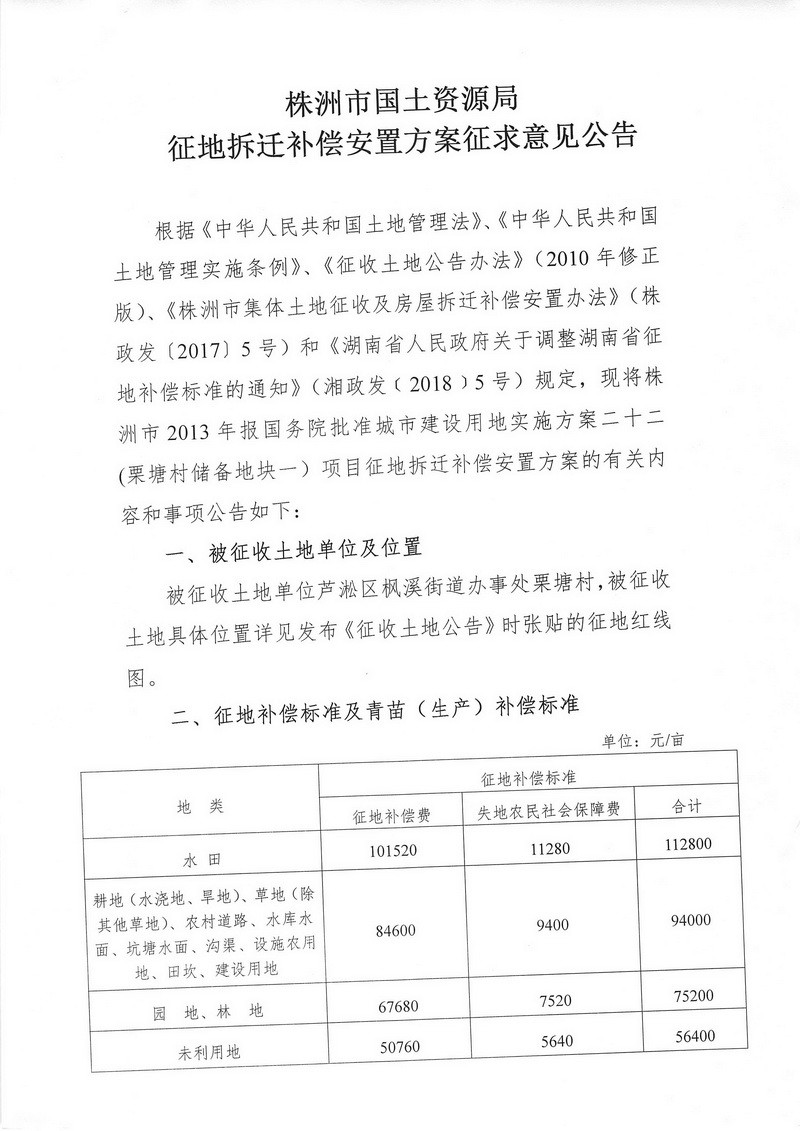 征地拆迁补偿安置方案征求意见公告--栗塘村储备地块一