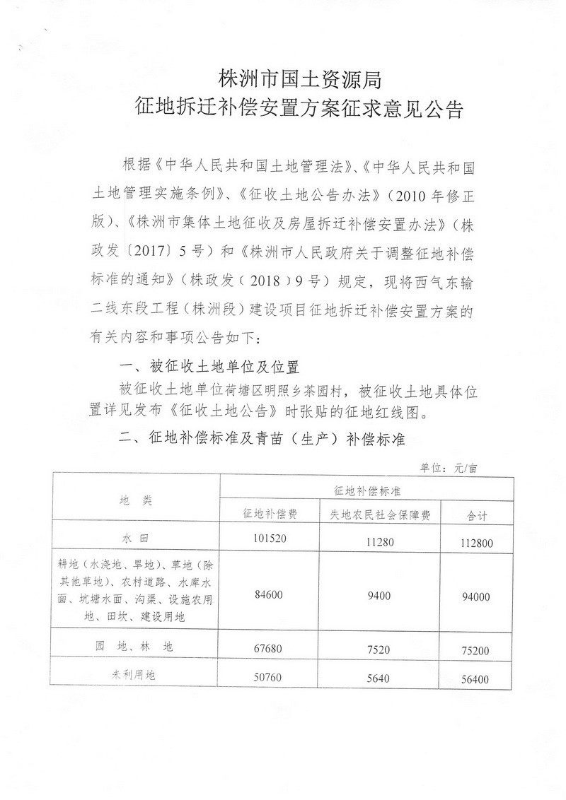 征地拆迁补偿安置方案征求意见公告-西气东输二线东段工程(株洲段)建设项目