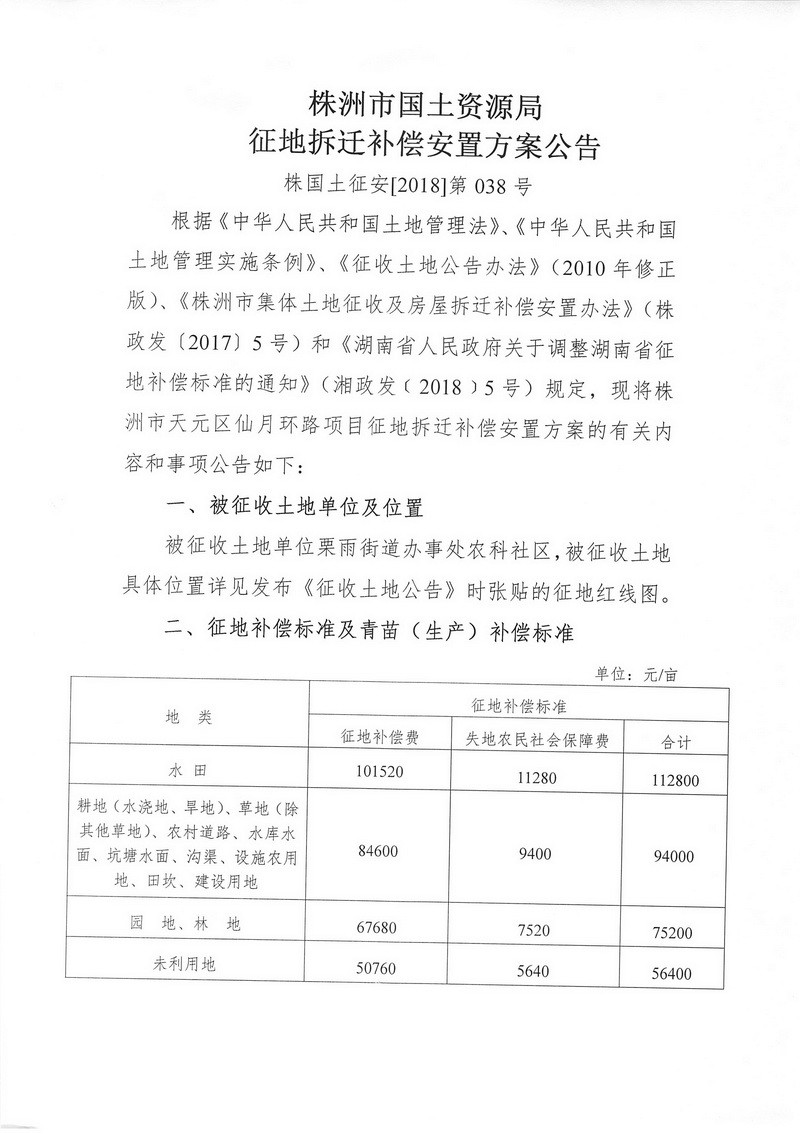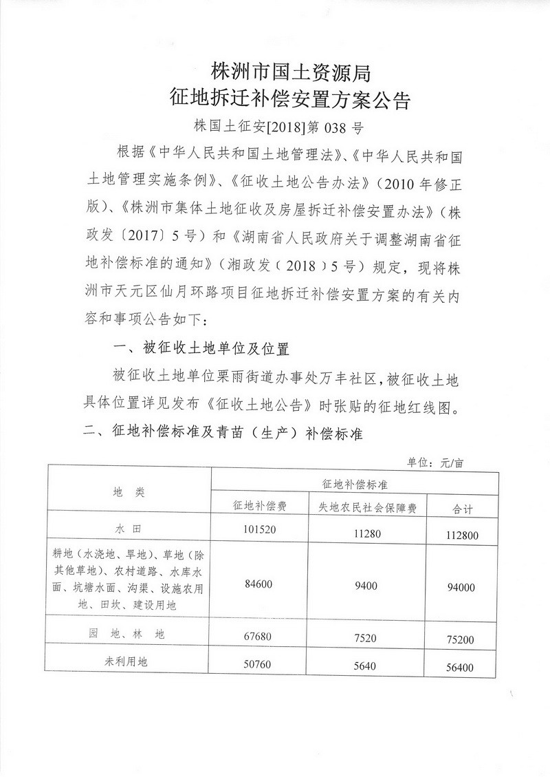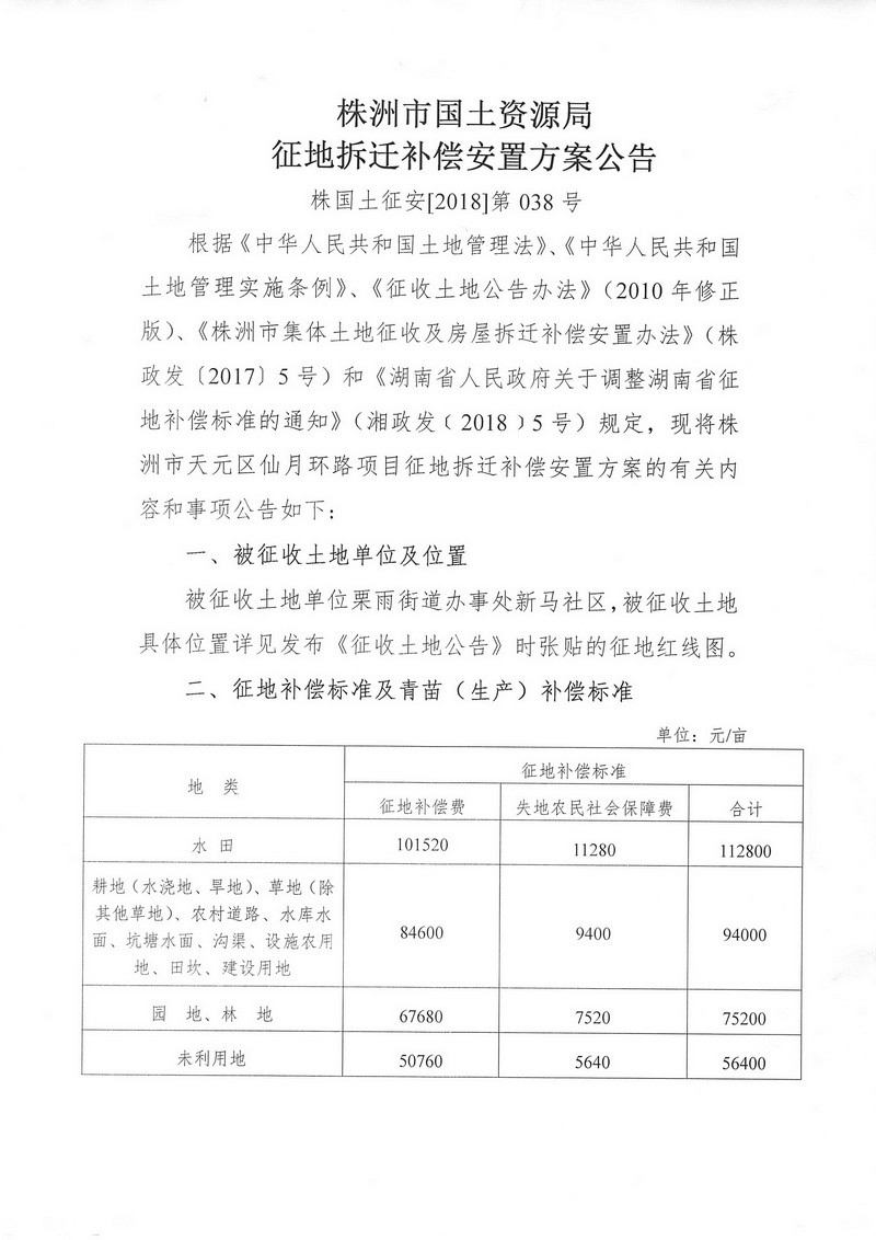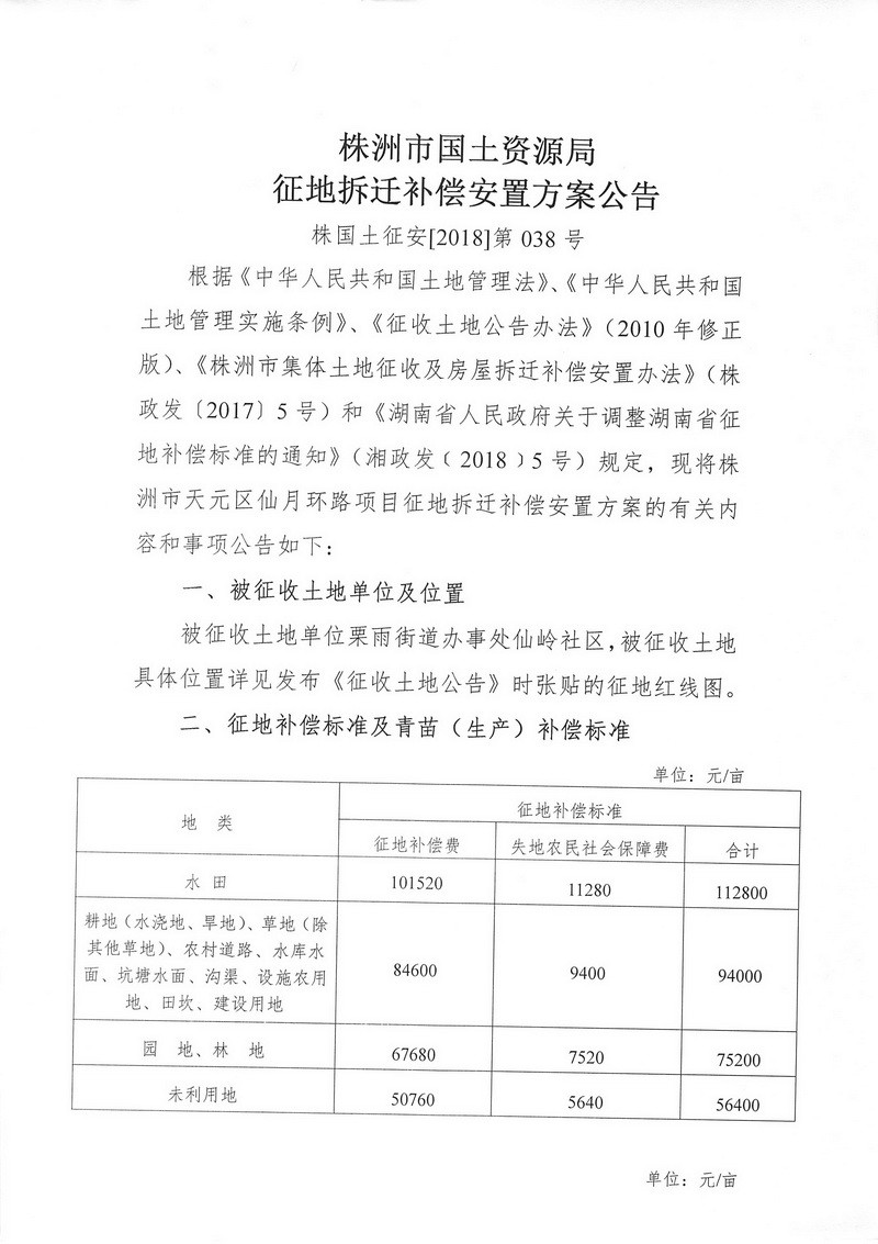 征地拆迁补偿安置方案公告-株洲市天元区仙月环路项目