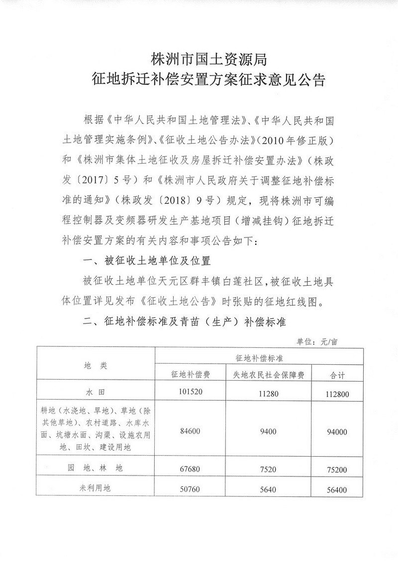 征地拆迁补偿安置征求意见公告--株洲市可编控制器及变频器研发基地项目