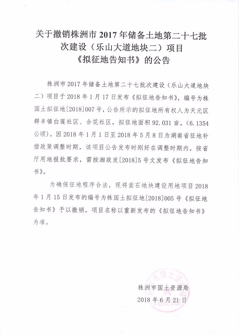 乐山大道地块二项目《拟征地告知书》撤销公告