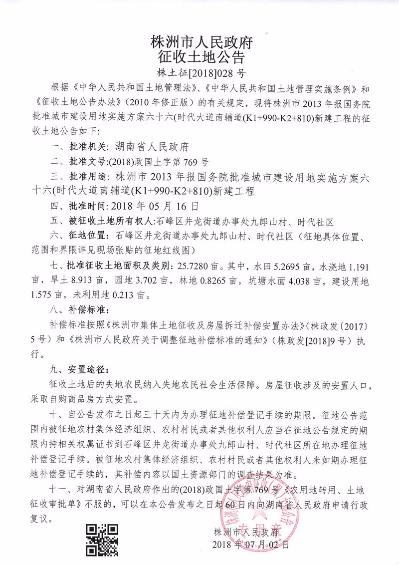 征收土地公告--时代大道南辅道(K1 990-K2 810)项目