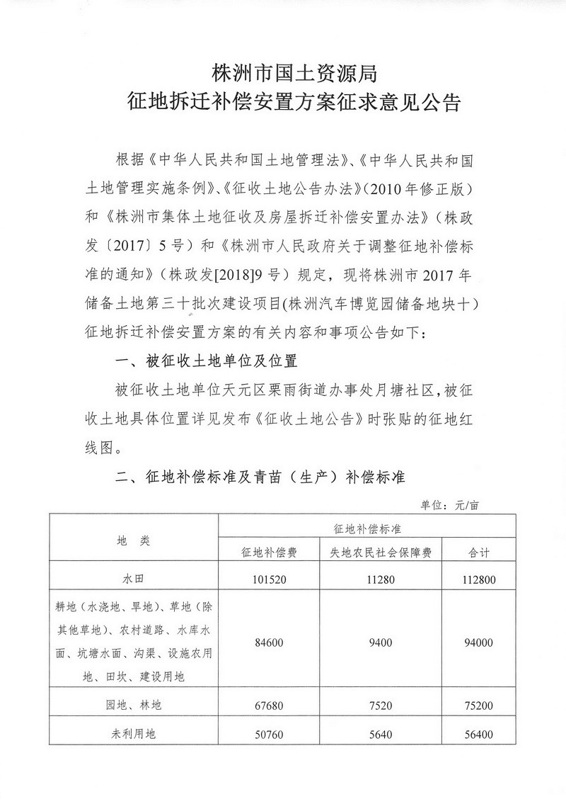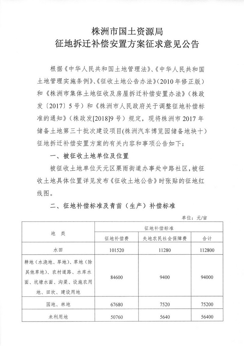 征地拆迁补偿安置方案征求意见公告--株洲汽车博览园储备地块十