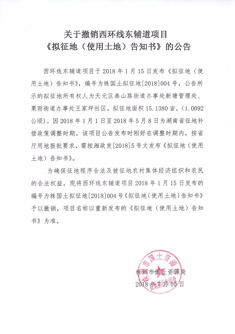 关于撤销西环线东辅道项目《拟征地(使用土地)告知书》的公告