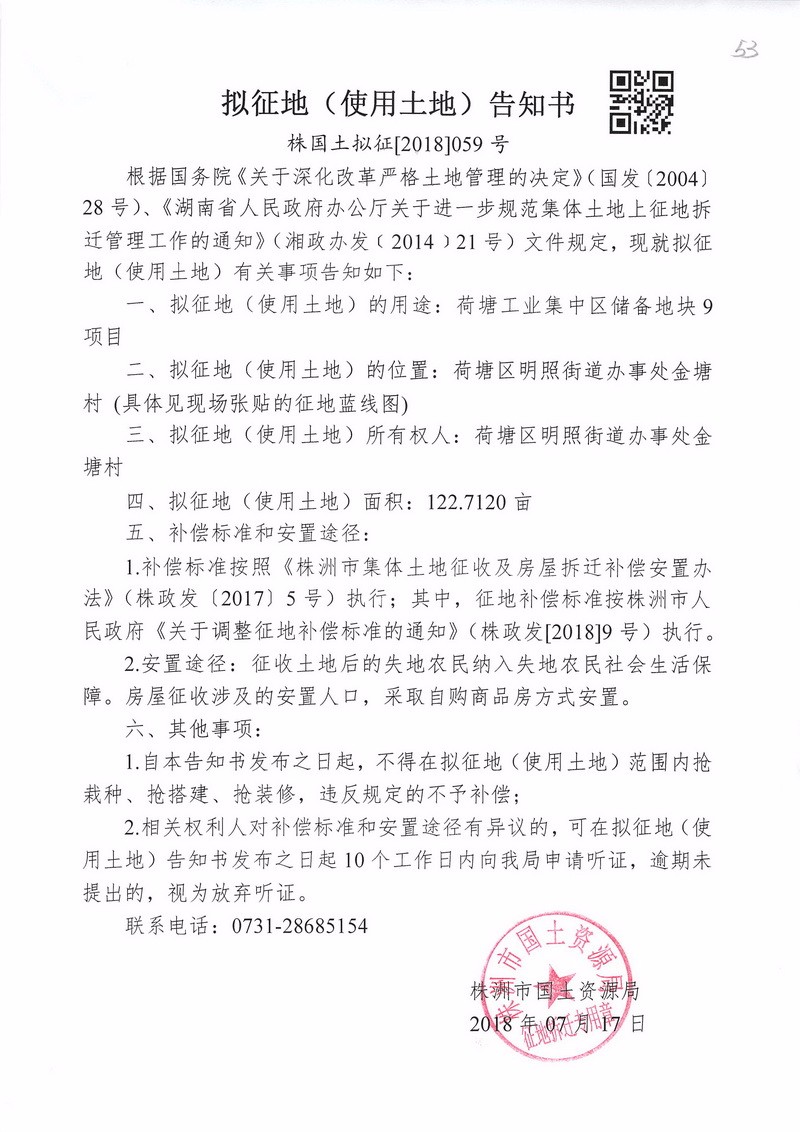 拟征地告知书--荷塘工业集中区储备地块9项目